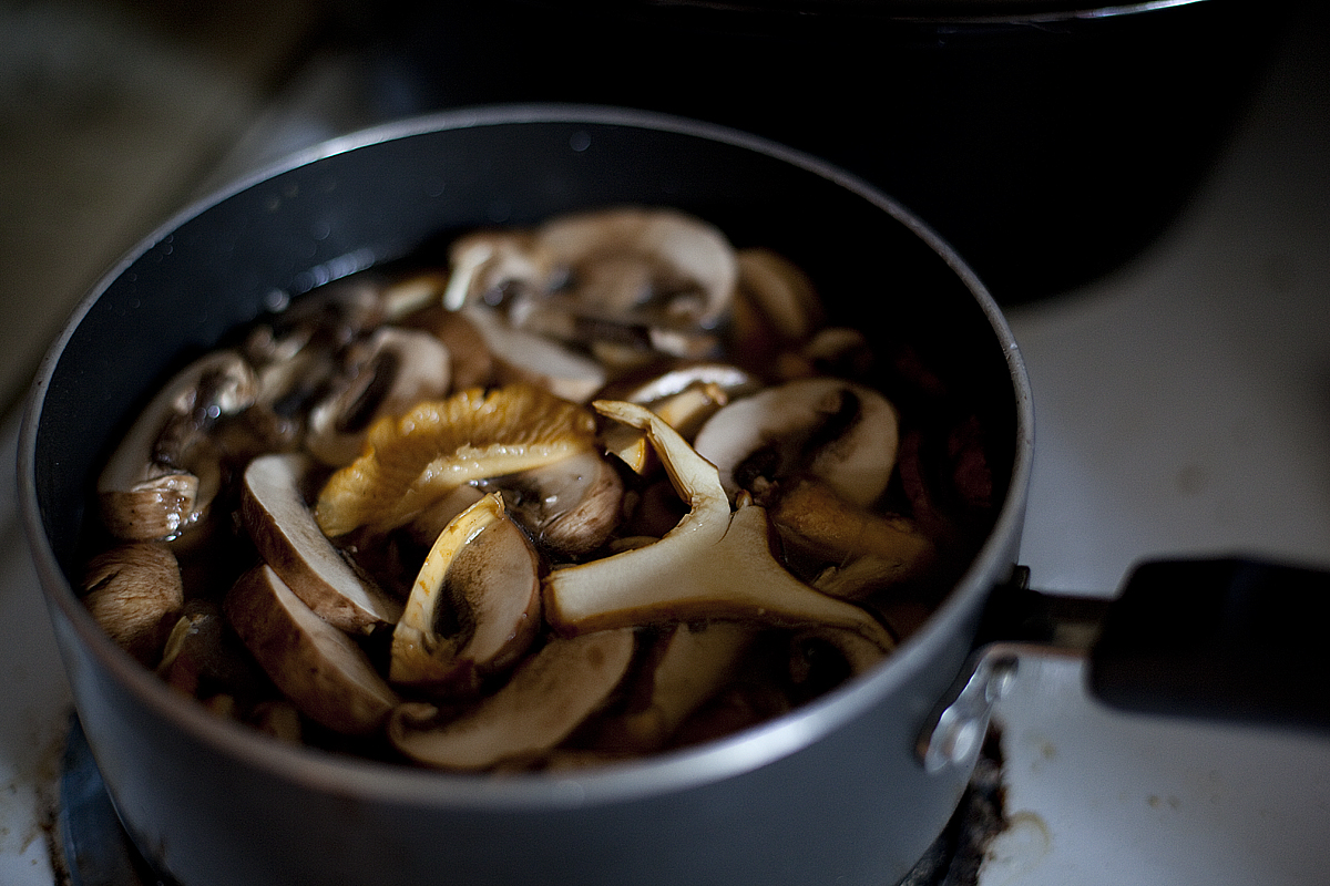 2. Add mushrooms and stir. Reduce heat to medium high and cook for five minutes.