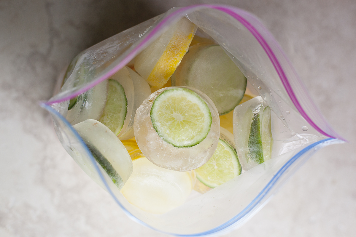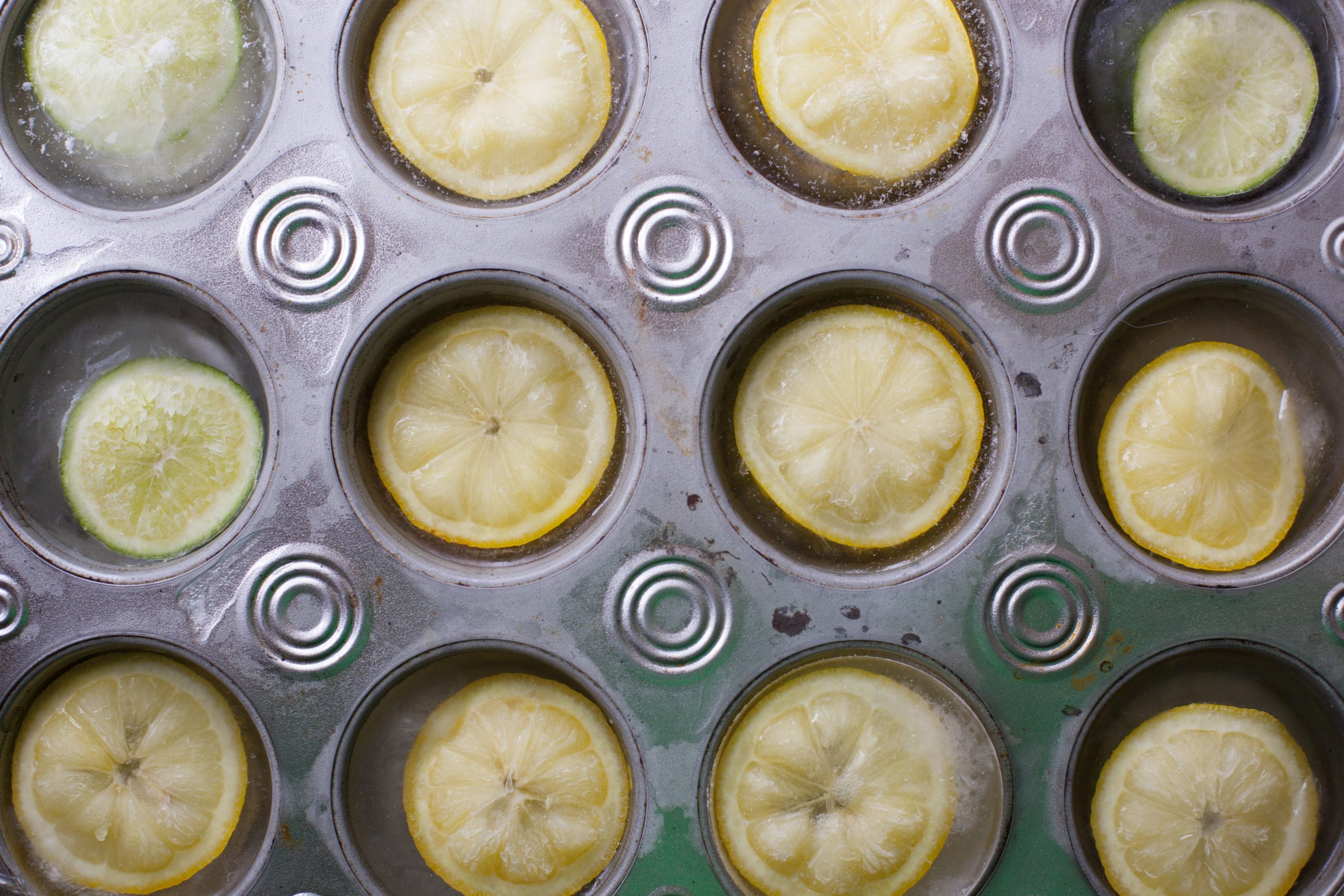 I try to slice up some Meyer lemons (they’re a bit sweeter) or other citrus fruits about once a month. I place them in a muffin tray, fill it 3/4 full with water, then put the muffin trays in my freezer.