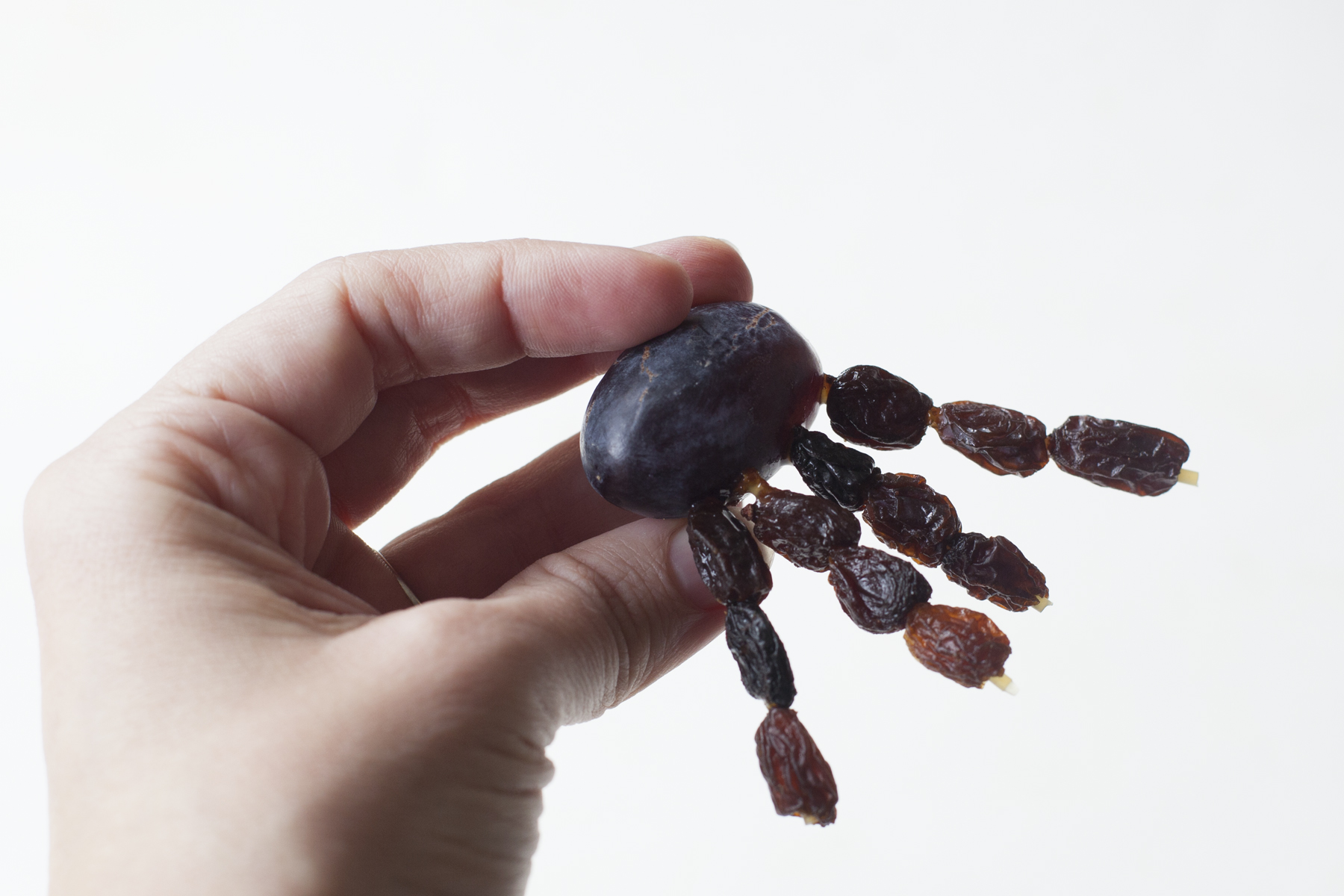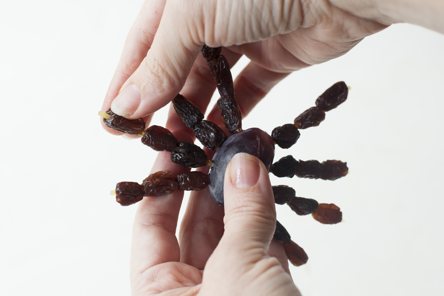 - Thread 3 raisins onto the end of a spaghetti noodle, and break the noodle about 1/4 inch above the first raisin. Repeat until you have 24 legs.