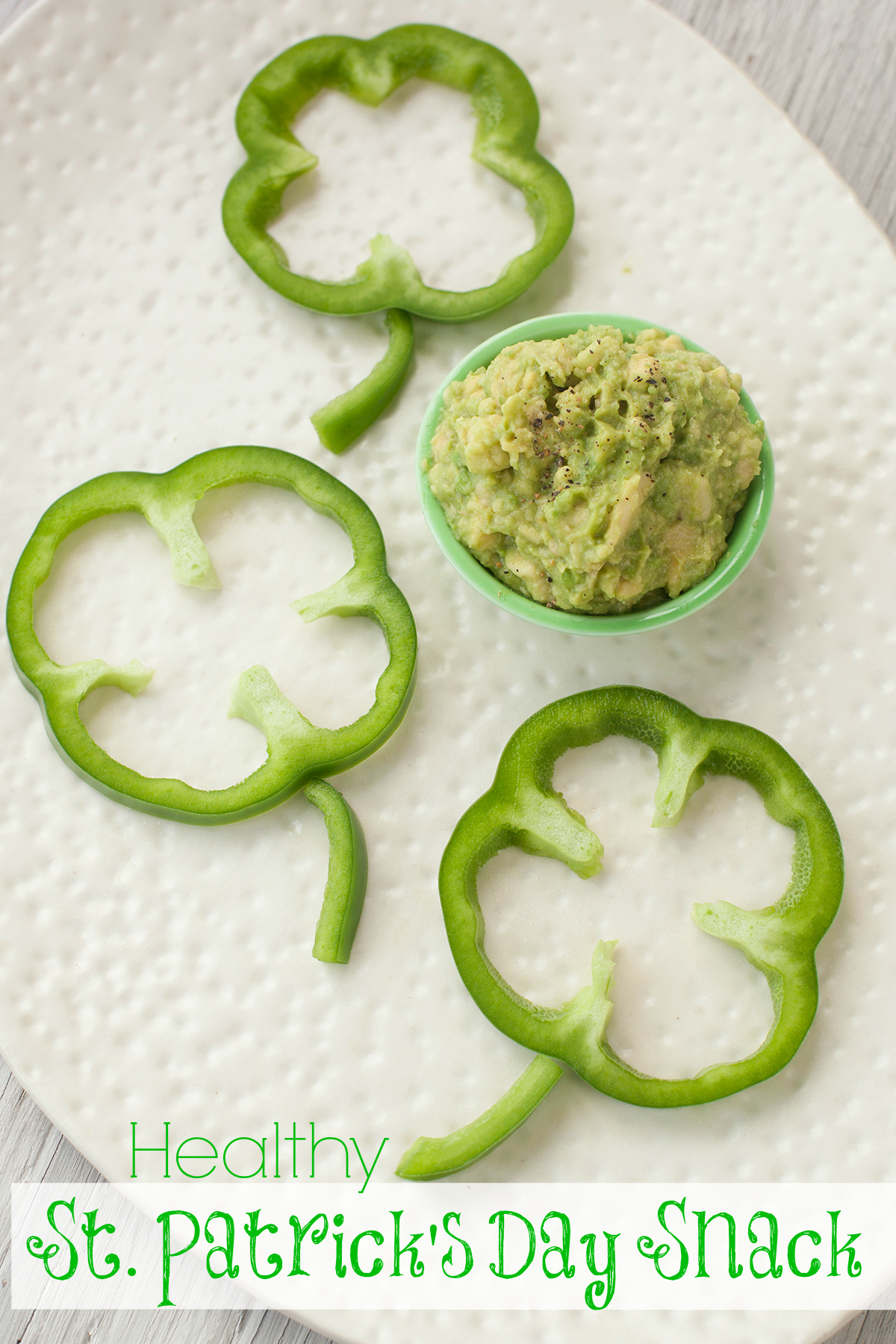 Bell pepper shamrocks with avocado dip make an all natural, healthy, St. Patrick's Day snack.