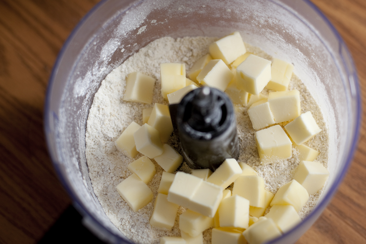 - When butter is done, pulse flour and sucanat in food processor until mixed. Add butter and pulse a few times until butter is pea sized. Add ice water a little at a time and pulse each time you add a little until the dough begins to form clumps.