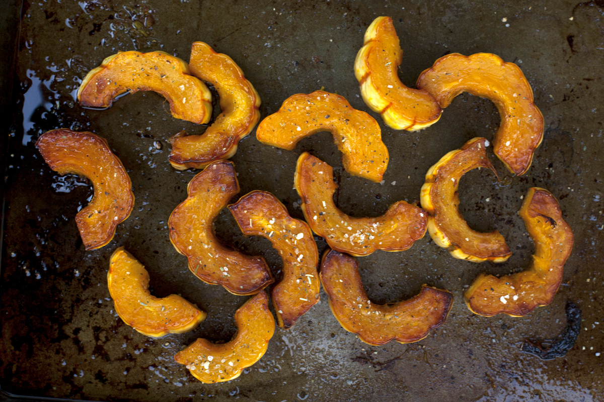 Beautiful delicata squash is roasted in olive oil and herb salts for a simple, flavorful, vegetable side dish.