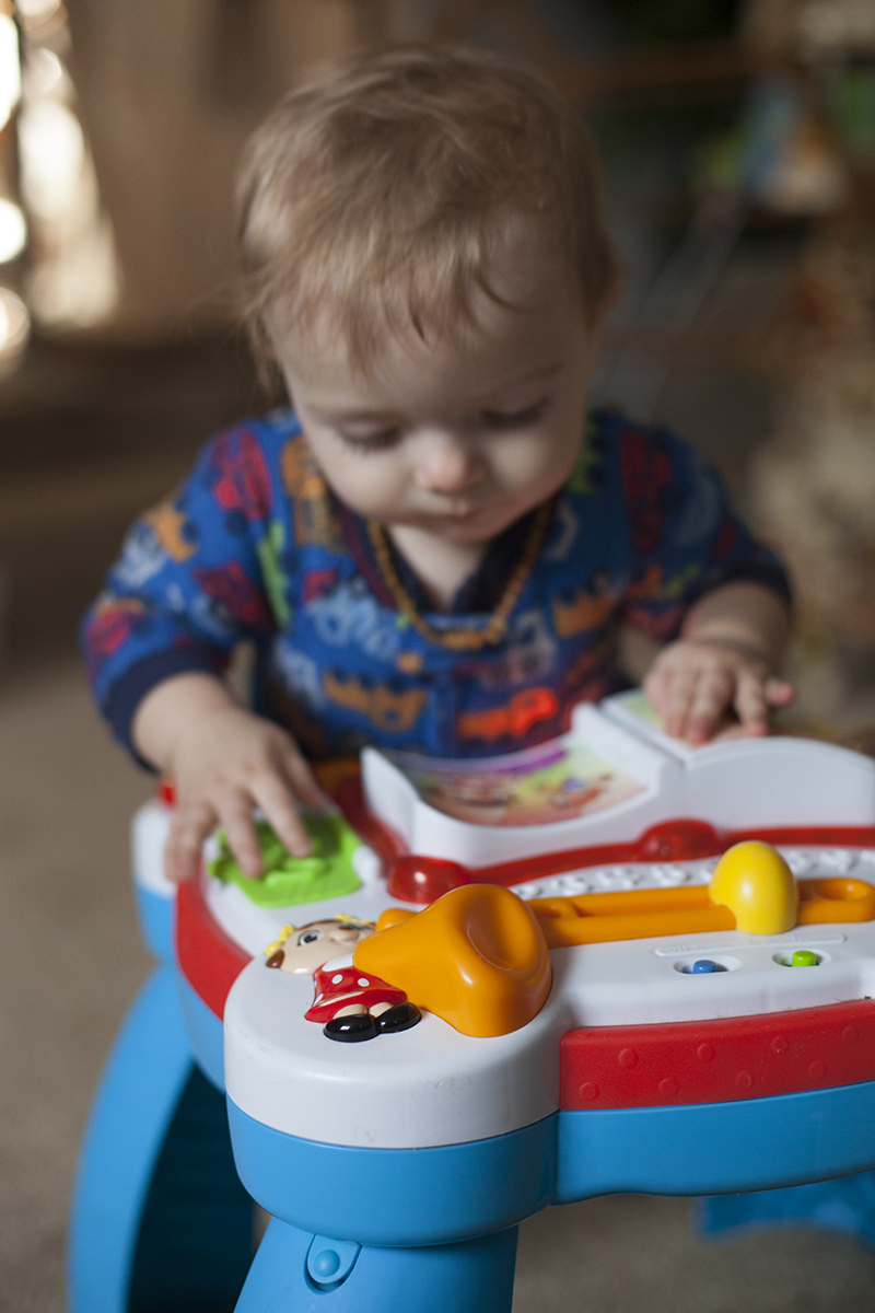 He has also been letting go of things while standing, testing out his balance for a few precarious seconds and then expertly dropping to his knees right when we’re sure he’s going to fall and hit his head.